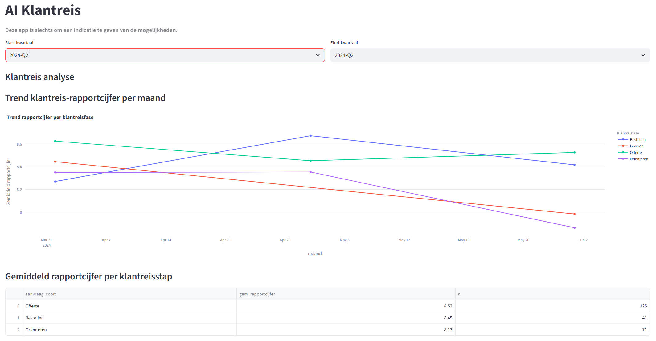 De demo bundelt klantdata en presenteert deze in een overzichtelijk scherm. Per stap in de klantreis ontstaat een helderder beeld van behoeften, vragen en knelpunten. Teams besteden minder tijd aan zoeken en meer tijd aan gerichte verbeteringen. Dat versnelt besluitvorming en verhoogt de consistentie in de klantbeleving.