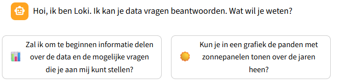 Vervolgens kun je aan de slag in de chat en kun je vragen stellen aan Loki. Tijdens het chatten krijg je suggesties voor (vervolg) vragen. Bijvoorbeeld tijdens de start van de chat maar ook na het stellen van een vraag. Hiermee probeert Loki je nieuwe mogelijkheden te laten zien, je te helpen scherper te krijgen wat je precies zoekt en je te inspireren om verder te verkennen wanneer dat zinvol is. Zo kun je aan het begin bijvoorbeeld vragen om informatie te delen over de data en mogelijke vragen die je kunt stellen en resultaten die je kunt ontvangen zodat je snel op weg wordt geholpen.