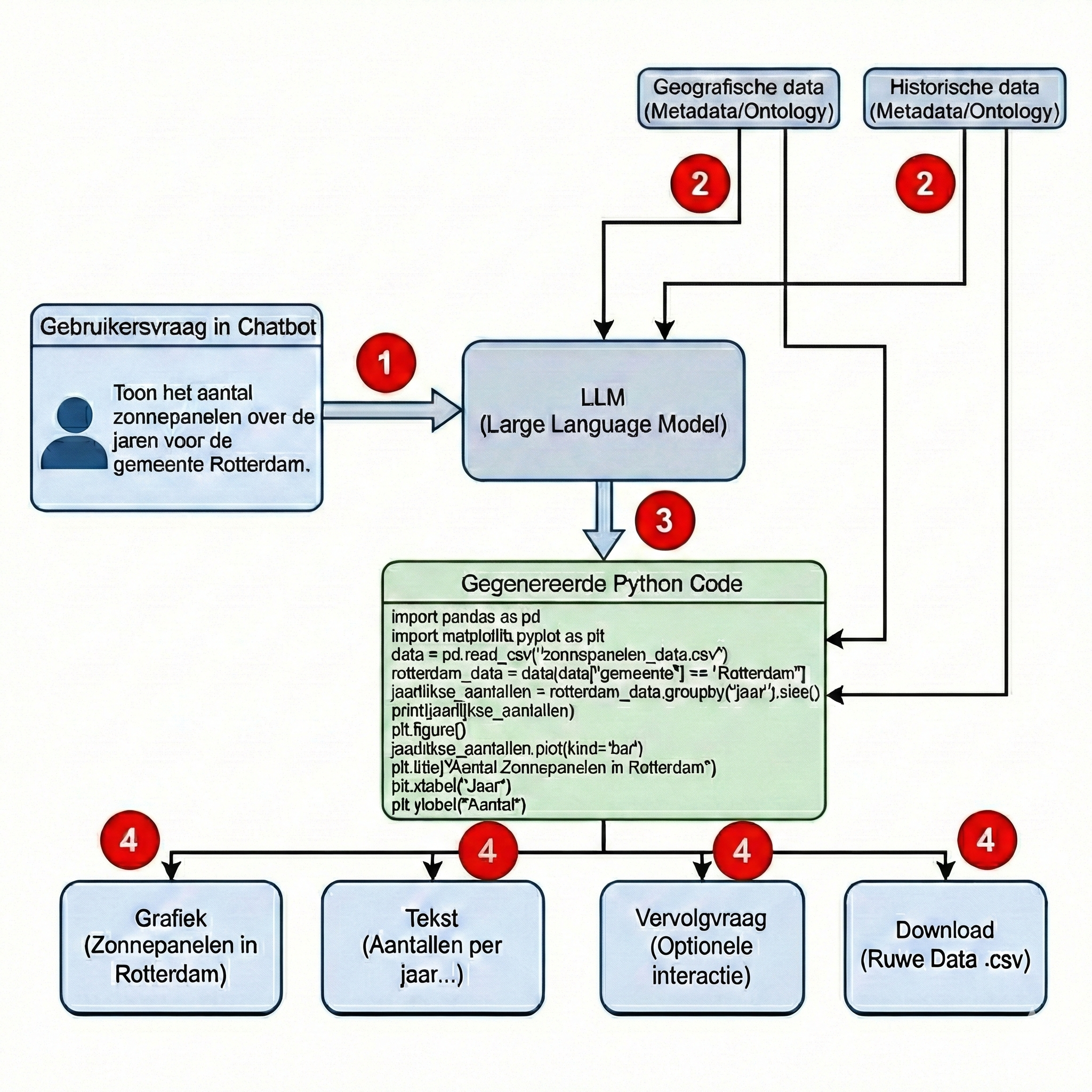 De gebruiker voert een opdracht in natuurlijke taal in (bijv.: “Maak een grafiek van de gemiddelde temperatuur in Amsterdam van de afgelopen week”). De web-app vangt deze tekst op en stuurt deze naar de backend.