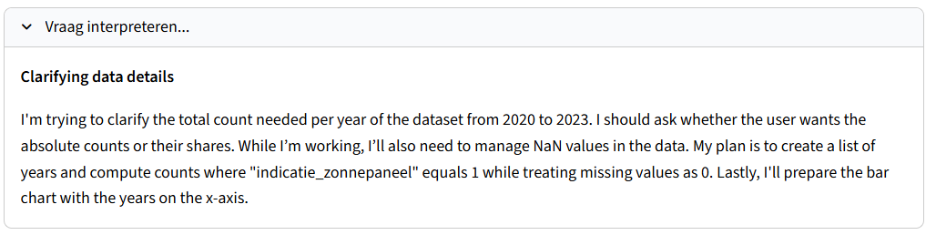 Terwijl Loki bezig is met je vraag laat Loki zien welke stappen doorlopen worden en hoe het antwoord op je vraag tot stand komt. Dit wordt ook wel ‘reasoning’ genoemd. Je krijgt dus niet alleen het eindresultaat, maar ook uitleg hoe dit tot stand komt erbij. Daardoor kun je beter en met meer vertrouwen beslissingen nemen of het antwoord past bij je vraag.