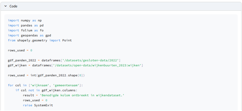 - Context: de metadata van de datasets, en instructies dat het model alleen een analyse in pure Python-code mag teruggeven