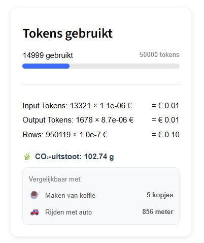 Via het tabblad “Usage” krijg je in de demo een indicatie van het verbruik van resources tijdens het gesprek. Dit is bedoeld ter illustratie en laat zien dat je een globaal beeld van het verbruik zou kunnen tonen en daarmee de impact van jouw interactie met Loki.