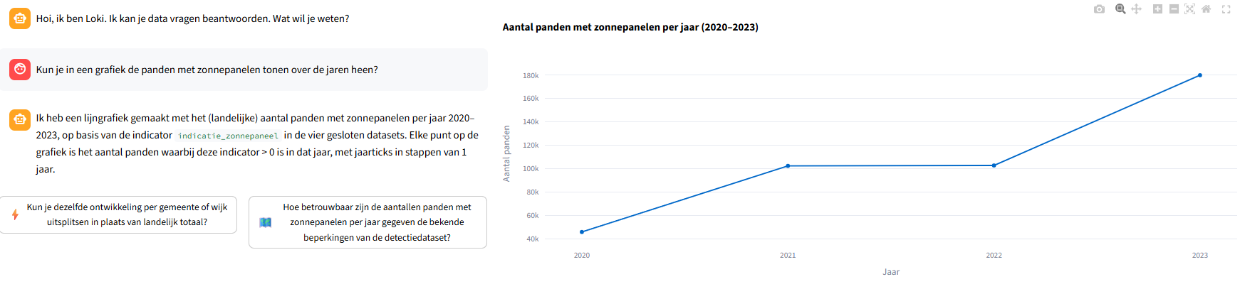 Loki Nexus is een innovatieve demo-chatbot die laat zien hoe je met hulp van nieuwe technieken, zoals AI, data-analyses kunt uitvoeren op uiteenlopende databronnen. Je stelt je vragen in normale taal en krijgt antwoorden in bijvoorbeeld tekst, grafieken of kaarten. Je hebt dus geen specialistische kennis nodig. Hiermee wordt data toegankelijk voor iedereen!